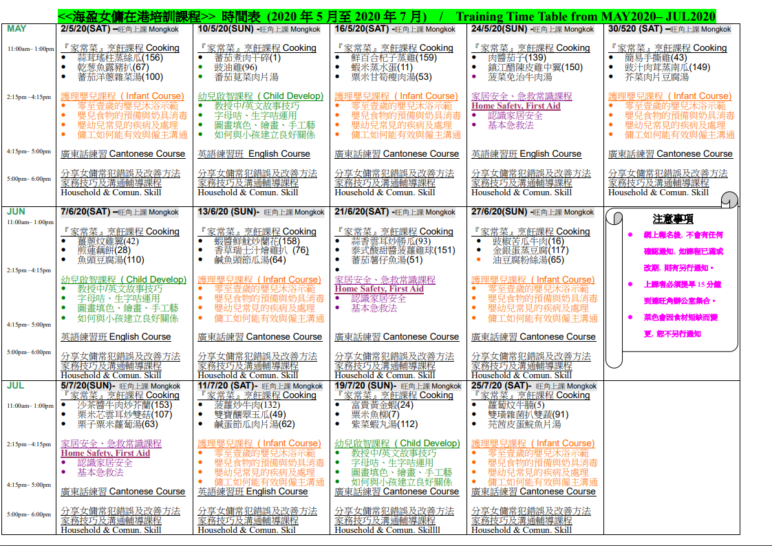 2018/08/09 - 海盈女傭在港培訓課程時間表 (2018年8月至2018年10月)