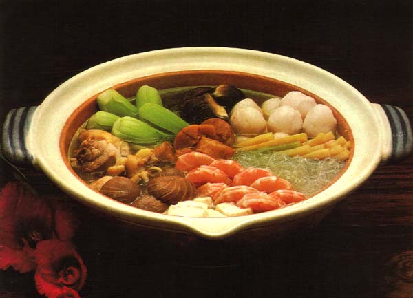 材料:6棵大白菜, 6棵青江菜, 1 隻雞腿, 6個冬菇, 3個干貝, 1把粉絲, 2磚切塊豆付, 10粒蝦丸, 10粒魚丸, 1 杯蘆荀, 1 杯毛菇