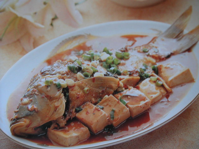 (1)鯉魚洗淨,擦乾;鍋內放油2大匙燒熱,先爆香蔥、姜, 焦香時撈除,再將魚放入,兩面略煎後盛出。 (2)以餘油炒香姜、蒜末和辣豆瓣,再放入調味料A 中的其他 調料和1杯清水燒開,將魚回鍋,改小火燒。 (3)豆腐切四方塊,放入,與魚同燒約12分鐘,使其入味。 (4)待湯汁稍乾時,淋入調味料B 勾芡,加入少許蔥花,使湯 汁微稠即可盛出。